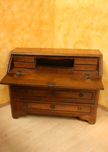 In noce massello composta da tre cassetti e un'anta a ribalta celante scarabattolo con vano a giorno e quattro cassettini, filettature in acero e carrubo.